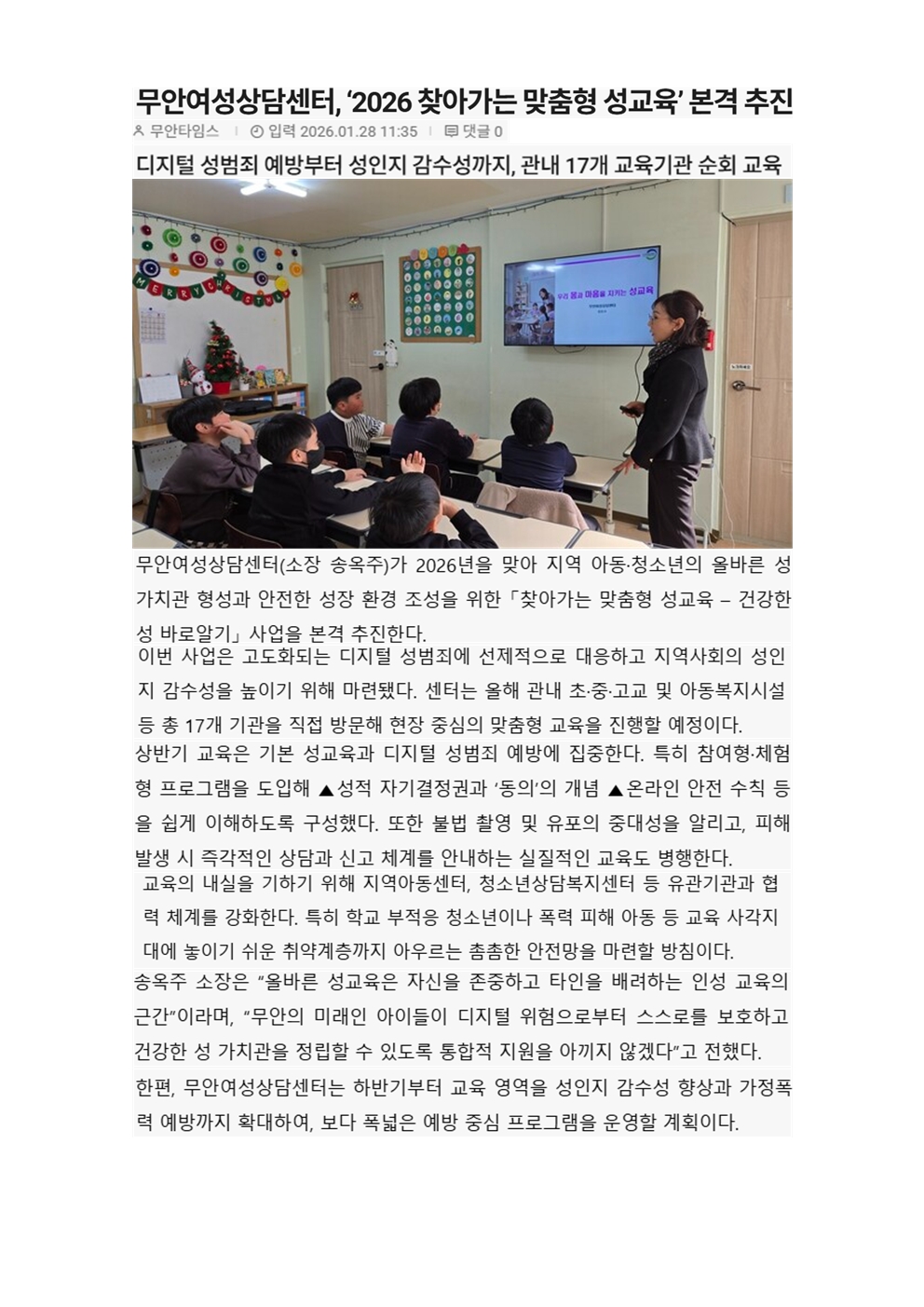 ¹«¾È¿©¼º»ó´ã¼¾ÅÍ, '2026 ã¾Æ°¡´Â ¸ÂÃãÇü ¼º±³À°' º»°Ý ÃßÁø(¹«¾ÈŸÀÓ½º)
