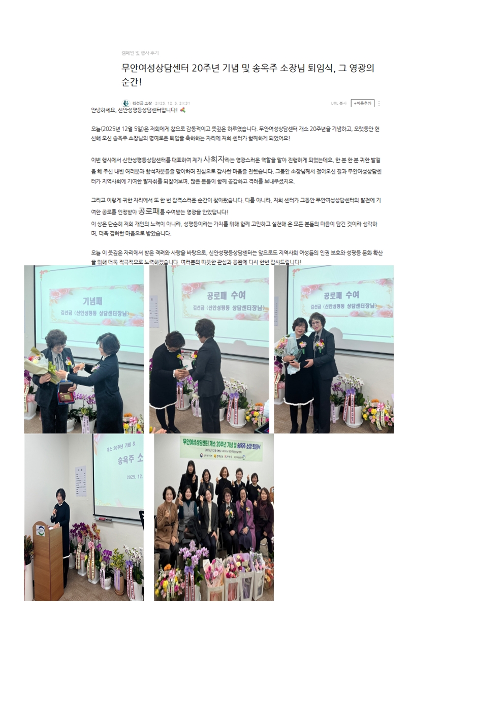 ¹«¾È¿©¼º»ó´ã¼¾ÅÍ ¼Û¿ÁÁÖ ¼ÒÀå, 20ÁÖ³â ¸Â¾Æ ¼ºÆòµî°¡Á·ºÎÀå°ü»ó¡¦