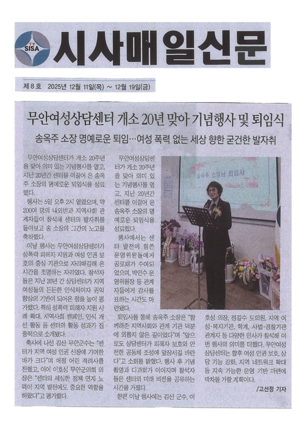 ¹«¾È¿©¼º»ó´ã¼¾ÅÍ ¼Û¿ÁÁÖ ¼ÒÀå, 20ÁÖ³â ¸Â¾Æ ¼ºÆòµî°¡Á·ºÎÀå°ü»ó¡¦