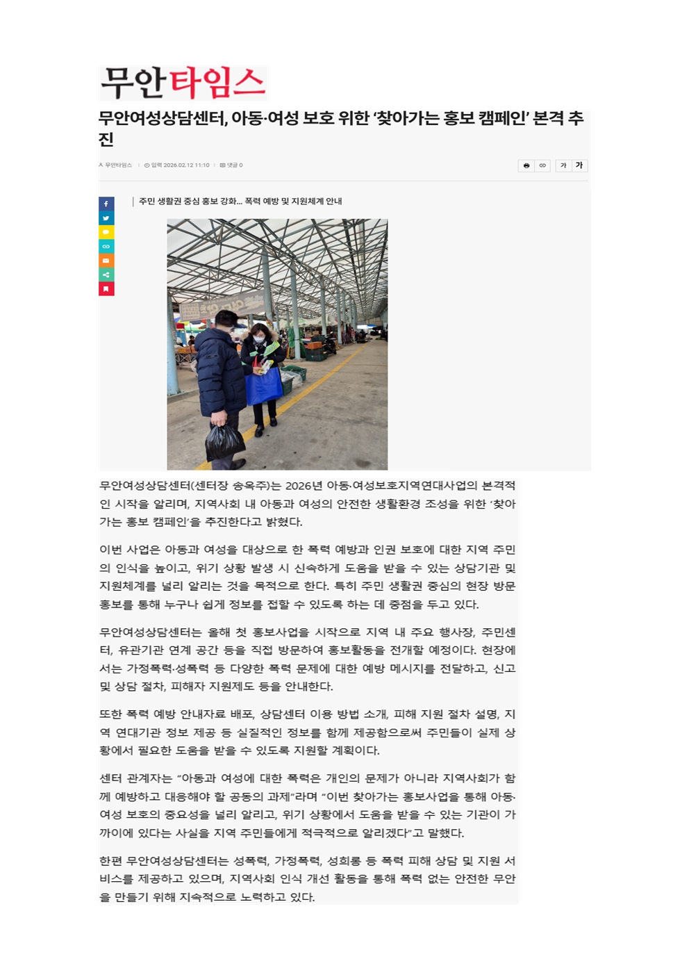 ¹«¾È¿©¼º»ó´ã¼¾ÅÍ, ¾Æµ¿¡¤¿©¼º º¸È£ À§ÇÑ ¡®Ã£¾Æ°¡´Â È«º¸ Ä·ÆäÀΡ¯ º»°Ý ÃßÁø(¹«¾ÈŸÀÓ½º)