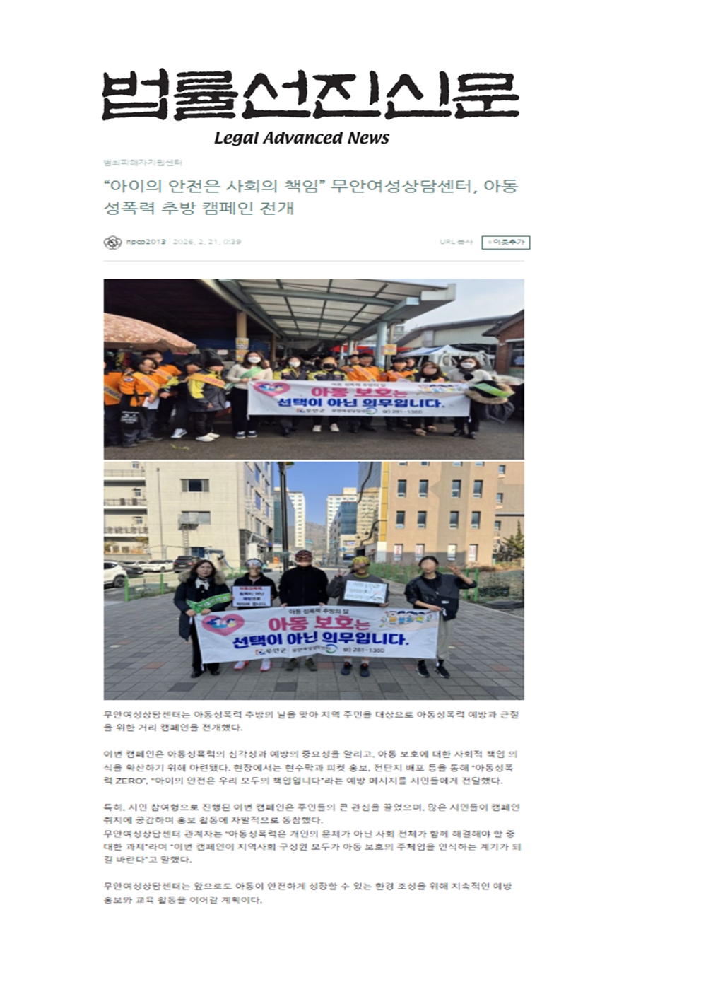 ¡°¾ÆÀÌÀÇ ¾ÈÀüÀº »çȸÀÇ Ã¥ÀÓ¡± ¹«¾È¿©¼º»ó´ã¼¾ÅÍ, ¾Æµ¿¼ºÆø·Â Ãß¹æ Ä·ÆäÀÎ Àü°³(¹ý·ü¼±Áø½Å¹®)